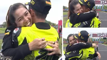 Dengan senyum semringah, Dimas Juliatmoko pun membalas dekapan Raya Kitty. Kru tim Merak Raja Dancer Racetech Ipone RCB Proliner KYB Kalimantan Timur kemudian turut meluapkan kegembiraan setelah menyaksikan pebalap kesayangan mendapatkan tempat utama di podium 1.